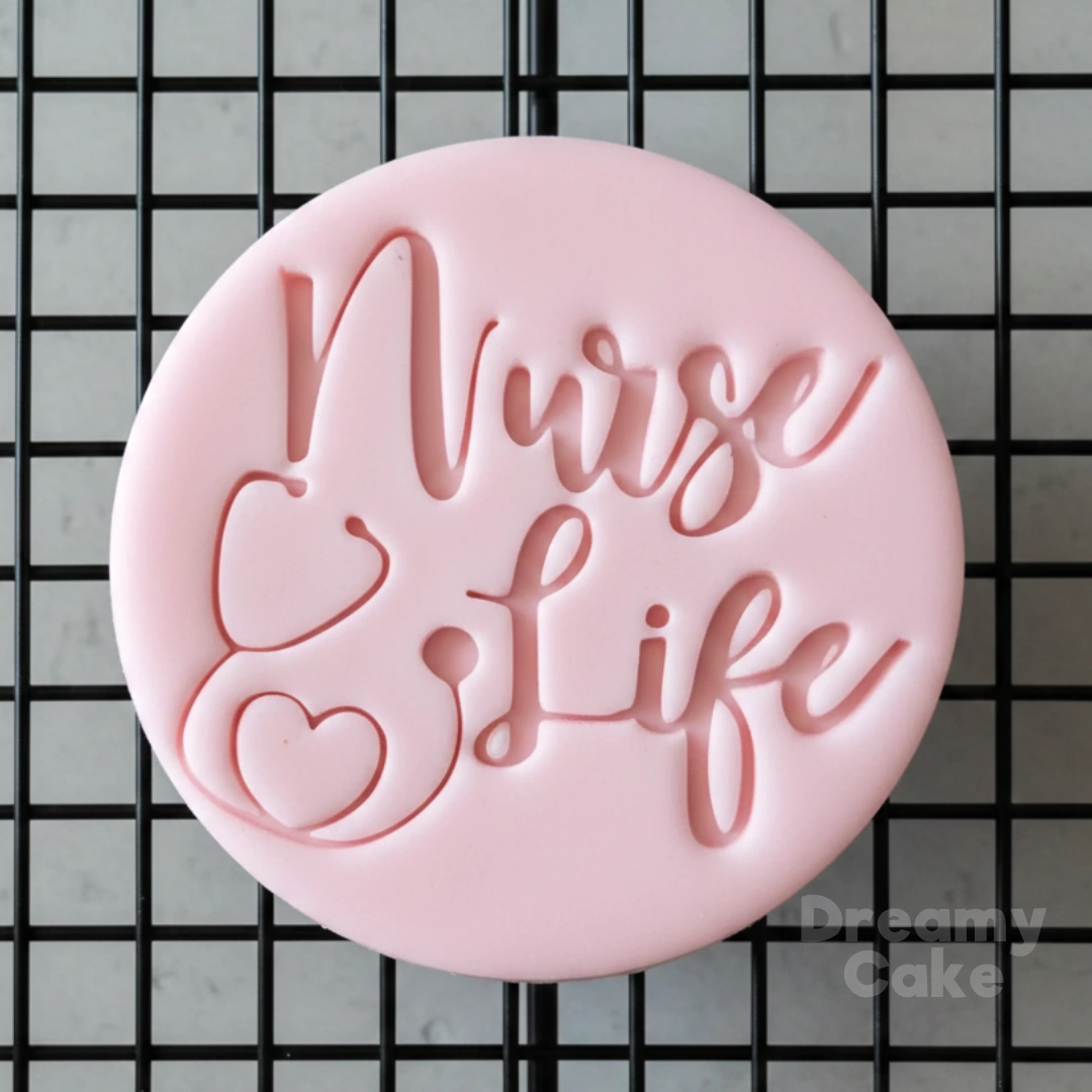 Nurse Life fondant embosser sized to fit M&S style biscuits. Creates crisp “Nurse Life” and heart stethoscope embossing for nurse appreciation, graduation and Nurses Week cookies
