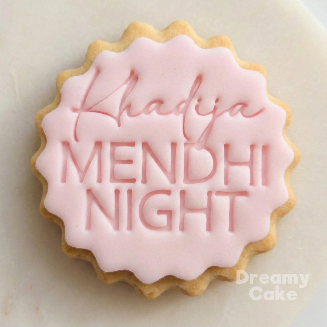 Personalised “Mendhi Night” cookie stamp with your chosen name on top. Ideal for mehndi/henna party favours, Nikkah trays and celebration biscuit boxes. Designed for sharp embossing on fondant, sugar cookies and cupcakes