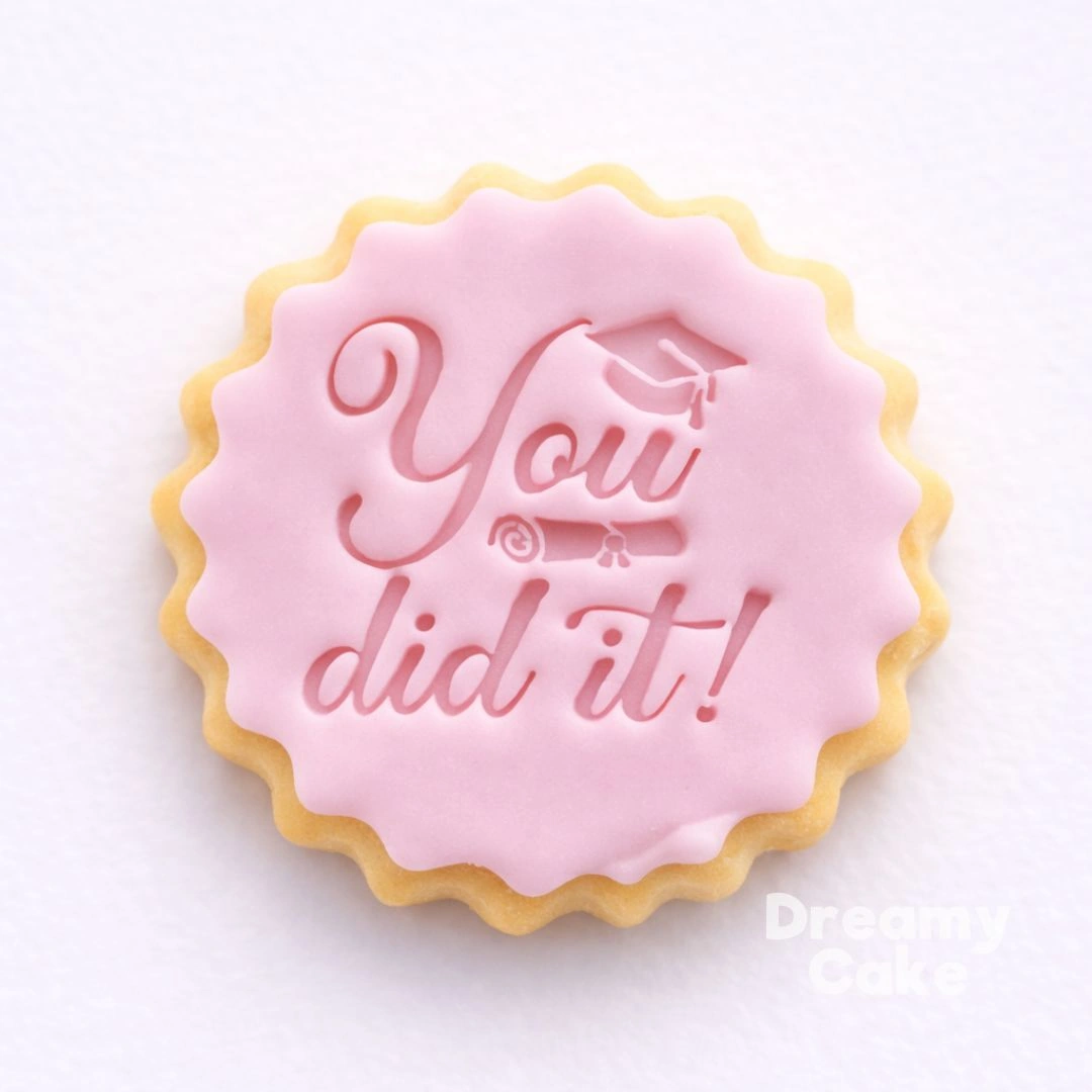 Create elegant Graduation themed bakes with this minimalist You did it cookie stamp, perfect for school leavers, prom nights and graduation parties. Designed for crisp impressions on fondant, icing and biscuits, this embosser helps you produce professional-looking celebration treats quickly and easily.